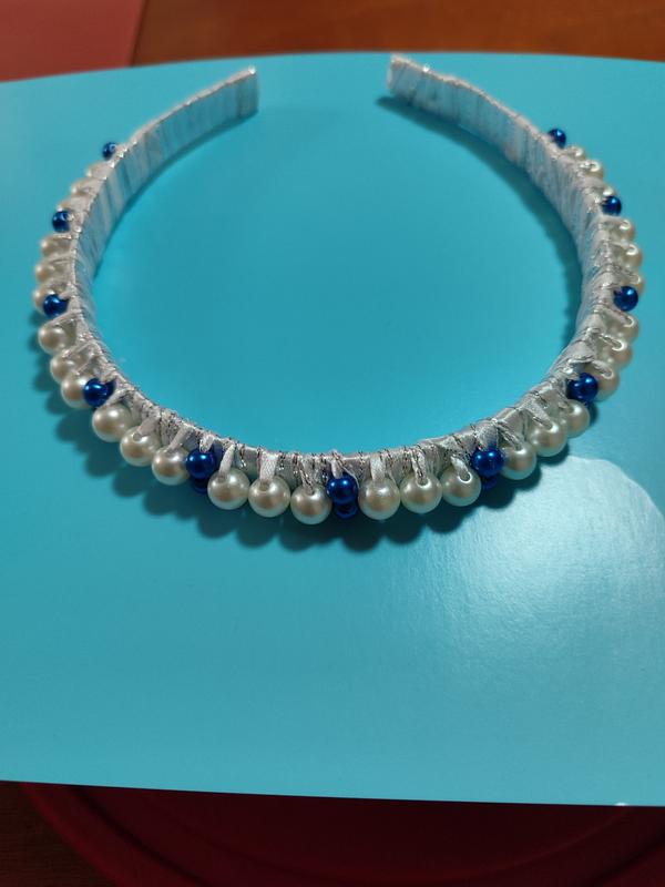 Обруч із намистинок білого та синього кольорів. Ширина обруча 1,2 см.