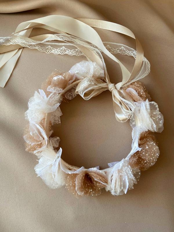 Обʼємний віночок. Чудово підійде для фотосесій та святкових подій. У віночку поєднано два кольори :темний бежевий і білий. Ручна робота та авторський дизайн. При виготовленні враховую всі Ваші побажання.. Можливе виконання в інших кольорах та під Ваш розмір.