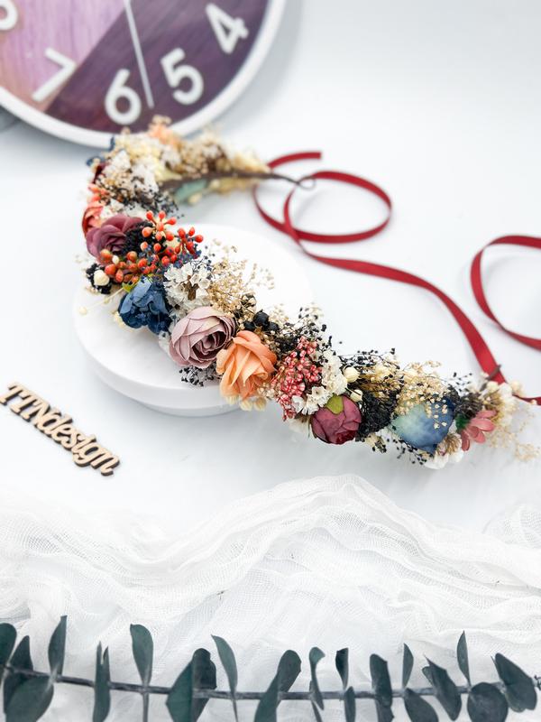 Віночок на голову з сухоцвітів у бордових, темно-синіх, оранжевих та білих тонах з стабілі...