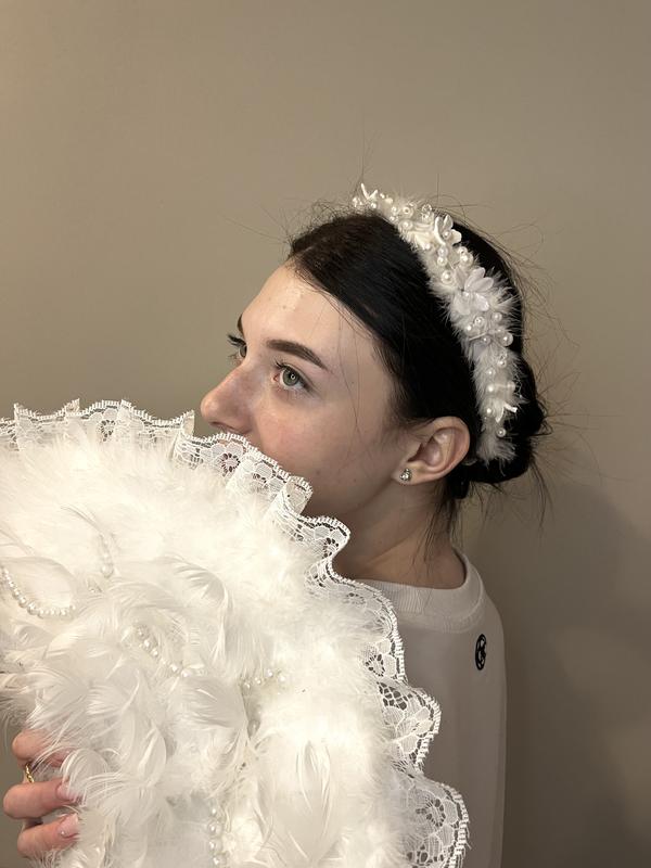 До вашої уваги прикраса на голову ручної роботи. Особливості: • Виготовлена повністю вручну • Білі пір'я та перлини створюють святковий образ • Надійне кріплення невидимками та стрічкою • Підходить для дівчаток різного віку Використання: • Урочисті події та свята • Фотосесії • Театральні виступи • Перше причастя Чудовий варіант подарунку для маленької принцеси. Прикраса додасть особливої урочистості будь-якому святковому образу.