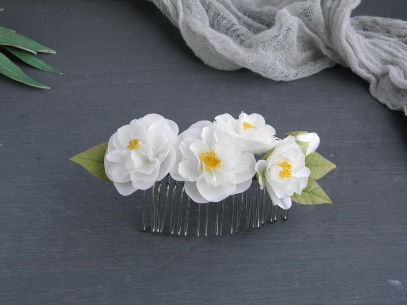 Ніжний гребінь з реалістичними білими квітами ручної роботи прикрасять вашу зачіску як у будні дні, так і в свято. З такою прикрасою ви не залишитеся без уваги! ♥Квіти і листя виконані вручну з фоамирана ♥Гребінь дуже легкий, приємний на дотик. Не боїться вологи, падінь, спеки, морозу ♥Композиція закріплена на металевому гребінці (можна зробити на шпильці) _______________________________ Якщо ви хочете ці квіти в іншому забарвленні, на іншій основі або додати вироби в комплект просто напишіть про своє бажання в коментарях до замовлення або зв'яжіться зі мною для обговорення деталей * Кольори в реальності можуть трохи відрізнятися за різних налаштувань і перенесення кольорів екранів. * Дивіться більше робіт в моєму магазині Товар виготовляється на замовлення
