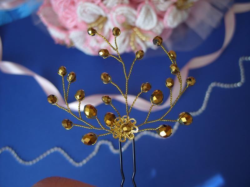 Золотиста шпилька ручної роботи. Можливе виконання 4-5 штук, які можна чудово розмістити в зачісці.