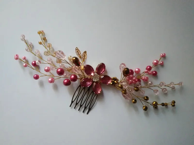Гребінець доповнить ваш образ на випускному, святкових подіях, додасть вишуканості нареченій. Основа виготовлена з металу (це додає гребінцю надійності та міцності) і має 5 зубців. Прикраса гребінця зроблена з кришталю та стразів. Колір: рожевий. Колір основи: золотистий. Розміри прикраси (без зубців): ширина 18,5 см., висота 7 см.