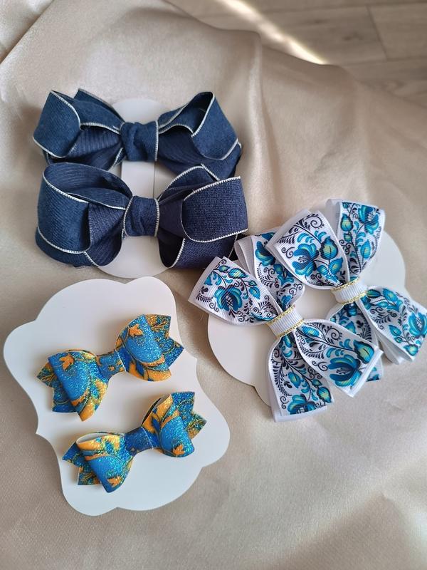 До набору входить: 2 темно-сині бантика на заколці 2 бантика з вишивкою на резинці 2 синьо- жовті бантика на резинці