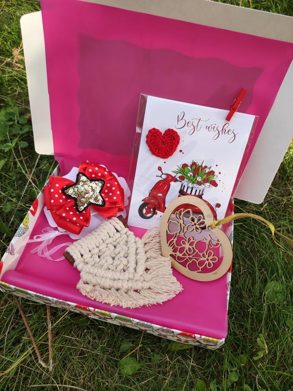 До набору входить червоний бант на заколці з золотою зіркою, міні-макраме на кориці, деревяне сердечко-підвіска та чарівна відкритка. Все запаковане в милу коробку з гномами та бантом. Готовий подарунок для вашої подружки.