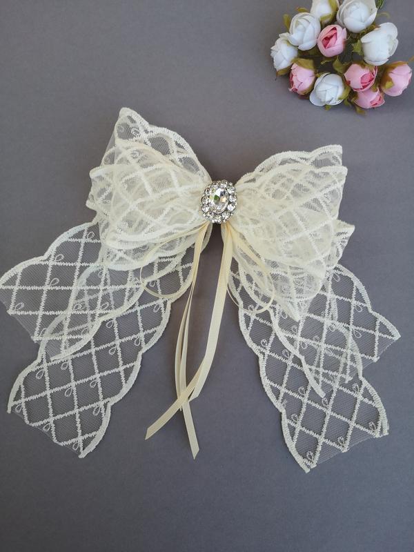 Бант ручної роботи з мережива на сітці. Серединка надійно пришита. В основі заколка-автомат. Розмір 17*20 см В Дніпрі можливий самовмвіз.