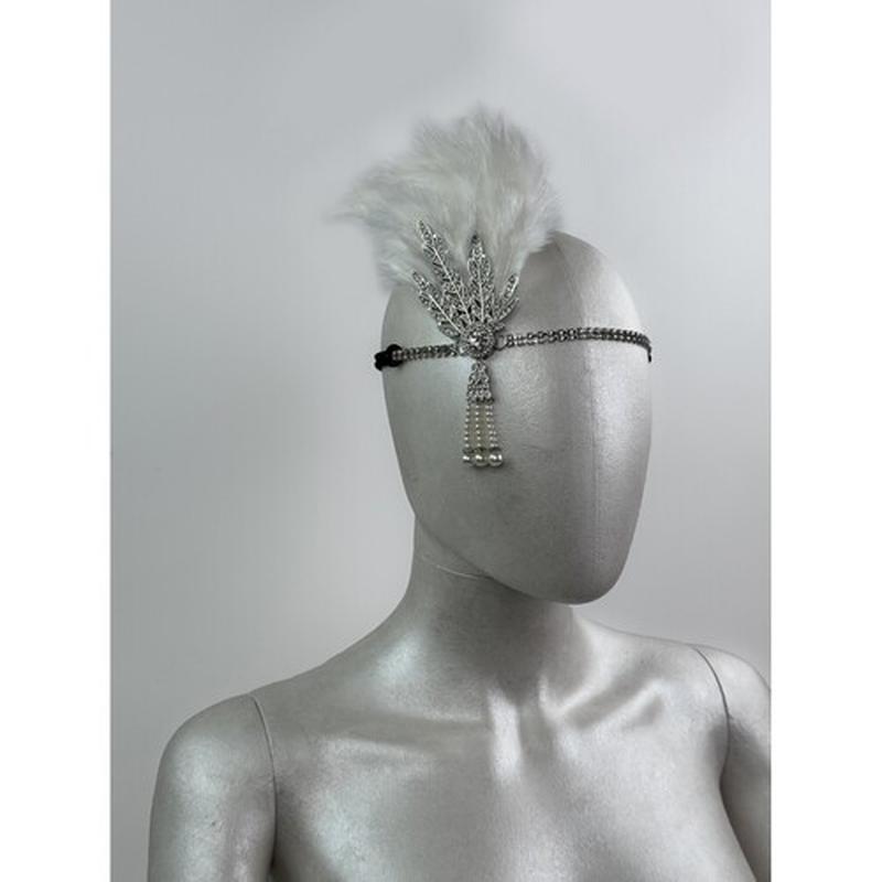 Красивая и эффектная серебристо-белая резинка на голову, украшенная перьями, камнями и жемчугом. Идеальна на вечеринку или корпоратив в стиле ретро, а также фотосессию. Длина перьев - до 18 см. Размер металлической основы со стразами 5 х 8,2 см. Длина подвески 5,3 см.