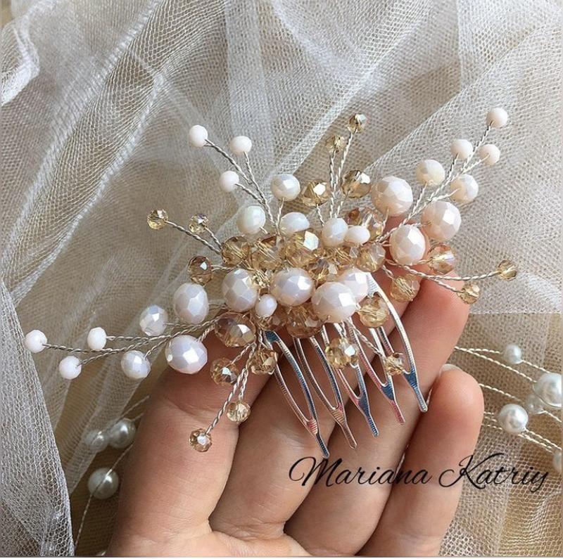 Ніжний гребінець в зачіску. Сплетений посрібленим дротиком з хрустальних бежевих бусин і бусин кольору шампань. Довжина плетіння приблизно 11 см. На замовлення колір бусин можна змінити на ваш вибір. Дополнительные характеристики: Цвет: Бежевый Отделка и украшения: Бусины Товар под заказ