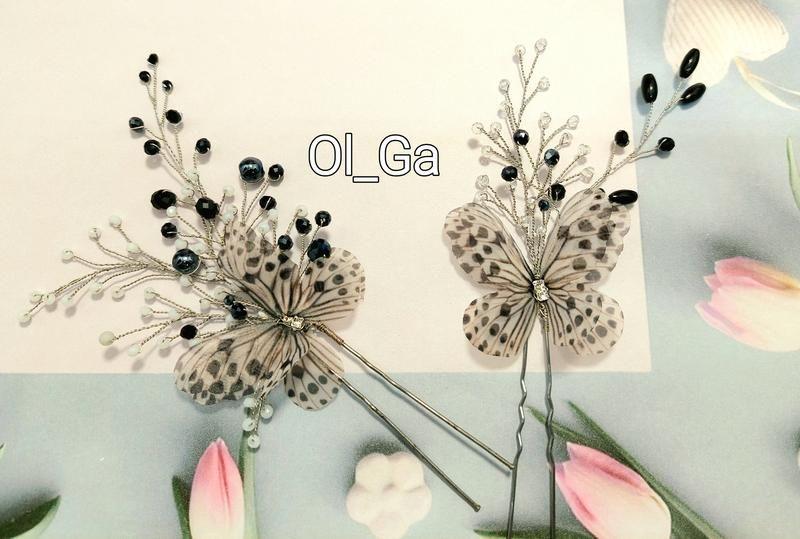 Ніжні шпильки в зачіску ручної роботи. Виготовлені з ювелірного дроту чорних і білих кришталевих бусин.