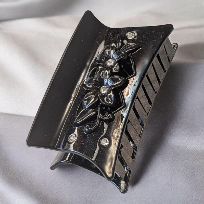 Заколка краб для волос прямоугольный с цветочками среднего размера 4х8 см черный