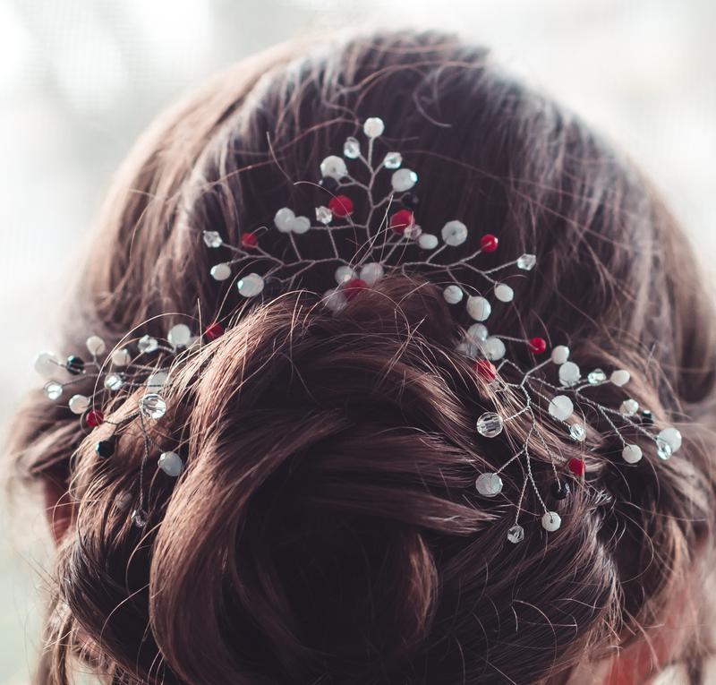 Білі, чорні та червоні намистинки, сріблястий дріт, темно-сірі невидимки. Фото моє, з весілля. Дуже ніжна й вишукана прикраса, не перевантажена зайвою "мішурою".
