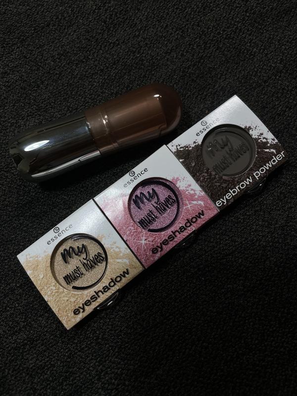 Косметика від essence. Тіні-однушки рожеві та золотисті з блискітками, дуже гарні та добре пігментовані. Тіні для брів сірі. Помада-бальзам коричневого кольору. Усе по 50 грн