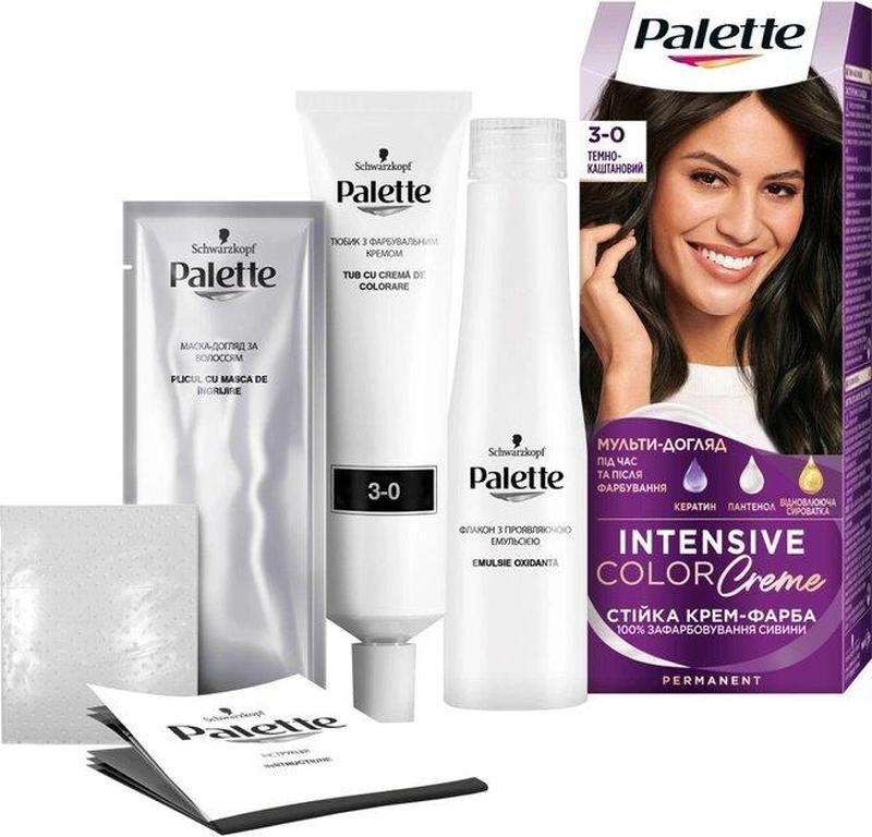 Відкрийте для себе стійку крем-фарба Palette Intensive Color зі збагаченою кератином формулою для стійкого інтенсивного кольору та сяйного блиску. Формула фарбувального крему з кератин-комплексом надає доглядову дію в процесі фарбування; а інтенсивні колірні пігменти глибоко проникають у структуру волосся для неймовірного сяйного кольору. Процес фарбування залишить відчуття м'якості та гладкості волосся; а нова формула надійно захистить ваш улюблений відтінок від вицвітання.