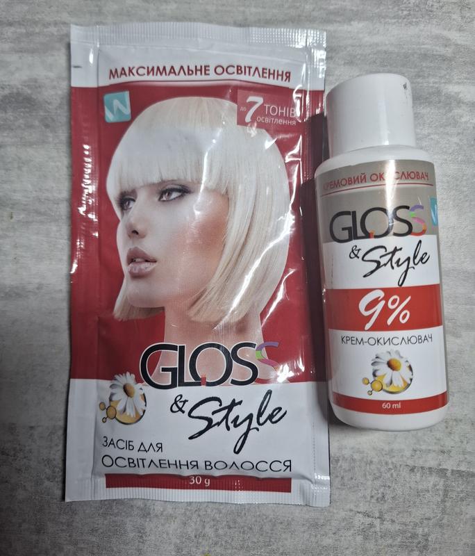 Засіб для освітлення волосся Gloss & Style та Крем окислювач для волосся Gloss&Style 9% Крем окислювач для волосся Gloss&Style 9% 60 мл Крем-окислювач Gloss&Style 9% — це професійний засіб, призначений для освітлення волосся та забезпечення ефективного результату при фарбуванні. Завдяки кремовій консистенції продукт легко змішується з фарбою та рівномірно наноситься на волосся. Ідеально підходить для складного освітлення або підняття тону на декілька рівнів. Основні переваги крем-окислювача Gloss&Style: Оптимальна концентрація 9% для інтенсивного освітлення. Кремова текстура забезпечує легке нанесення та рівномірний розподіл. Забезпечує стійкий і передбачуваний результат при фарбуванні. Сумісний із більшістю професійних фарб для волосся. Зручний об’єм 60 мл — ідеально для разового використання. Підходить для: Освітлення темного або натурального волосся. Використання з професійними фарбами та порошковими знебарвлювачами. Домашнього або салонного застосування за умови дотримання інструкцій. Засіб для освітлення волосся Gloss & Style 30 г Засіб для освітлення волосся Gloss & Style допомагає досягти ефектного білого кольору без небажаного жовтого відтінку. Його формула дозволяє освітлити волосся на 3–7 тонів, зберігаючи при цьому делікатне ставлення до структури волосся. Продукт ефективно підходить для освітлення натурального та фарбованого волосся, забезпечуючи м’який, рівномірний результат. Основні переваги засобу Gloss & Style Освітлює волосся до 7 тонів без ефекту жовтизни. Забезпечує делікатну дію завдяки збалансованому складу. Підходить для натурального та фарбованого волосся. Містить заспокійливі та захисні компоненти, включаючи олію ромашки аптечної. Просте використання вдома з чіткими інструкціями. Підходить для: Делікатного освітлення волосся на 3–7 тонів. Країна-виробник: Україна У подарунок при покупці будь-якого іншого мого товару