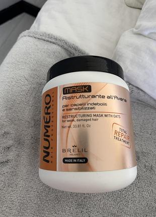 Маска для волосся від бренду numero З 1000 мл залишок приблизно 950 мл! Призначення: відновлення, живлення Інгредієнти: протеїни Час застосування: універсальний Стать: для жінок Класифікація: професійна Тип волосся: пошкоджене, сухе Країна ТМ: Італія Зроблено в: Італія Ваше волосся стало сухим і ламким у результаті частого укладання феном і плойками? Не впадайте у відчай, вихід існує. Професійна відновлювальна маска для волосся з екстрактом вівса Numero Total Repair Mask від італійської торгової марки Brelil ідеально впорається з цими проблемами! Активним компонентом у складі цього чудодійного засобу виступає екстракт вівса. Цей чудовий злак містить цінні протеїни, завдяки яким має чарівну властивість інтенсивно живити і відновлювати пошкоджену структуру волосся. Спеціальна високоактивна формула маски насичує волосся корисними елементами, ефективно зміцнює його, запобігаючи посіченню і ламкості. В результаті ваше волосся стане блискучим і доглянутим на вигляд.