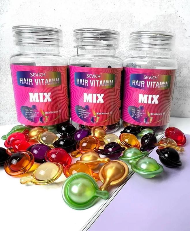 Вітамінні капсули для волосся Sevich Hair Vitamin Mix містять у баночці мікс із 7 видів капсул. Ви можете використовувати такий комплекс для інтенсивного догляду за волоссям або, протестувавши, вибрати найвідповідніші капсули для вашого типу волосся. Типи капсул: 🤎Червоні (4 шт.) — для відновлення пошкодженого волосся — оздоровлюють, надають блиску, захищають. Містять у складі комплекс вітамінів А, С, Е, В5, олію жожоба, марокканську олію. 🤎Фіолетові (4 шт.) — для фарбованого волосся — зберігають колір фарбованого волосся, надають гладкості та сяйва. Містять марокканську олію, олію підсрібника, олію сої, арганову олію, вітамін А і С. 🤎Зелені (5 шт.) — для сухого та посіченого волосся — зволожують, склеюють посічені кінчики, глибоко проникають у структуру волосся, усувають сухість, запобігають ламкість. Містять олію насіння камелії, марокканську олію, вітамін В5. 🤎Чорні (5 шт.) — для темного волосся й захисту від сонця — підсилюють блиск темного волосся, живлять і захищають від ультрафіолету. Містять олію кукуї, алое вера, марокканська й арганова олія. 🤎Жовтогарячі (4 шт.) — для живлення ламкого волосся — глибоко живлять структуру волосся, зволожують, запобігають виникненню посічених кінчиків. Містять екстракт меду, екстракт женьшеню, вітамін Е. 🤎Жовті (4 шт.) — для живлення і блиску — глибоко живлять і зволожують волосся по всій довжині. Насичують корисними вітамінами, містять цілющий олійний комплекс, який запобігає сухості та виснаженню, робить волосся слухняним, гладким і блискучим. Містять алое вера, олію сої, марокканську олію. 🤎Золоті (4 шт.) — для ламкого та пористого волосся — живлять і зволожують сухе волосся, роблять його здоровим, блискучим і слухняним. Допомагають утримувати вологу, створюють захисний бар'єр на поверхні волосся, запобігають заплутуванню. Містять олію жожоба, алое вера, олію сої, марокканську олію, арганову олію. Спосіб застосування: ❗1. Розріжте капсулу та видавіть вміст. ❗2. На вимите та підсушені рушником волосся розподіліть засіб на всій довжині, на корені не наносити. Не змивати.❗ ❗3. Висушіть волосся звичайним способом. Ціна 270 грн💵
