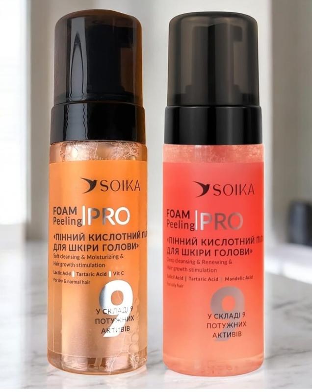 ✨Пінний кислотний пілінг для шкіри голови SOIKA Foam Peeling Pro Обʼєм 150 мл Представляємо вашій увазі вперше розроблені в Україні інноваційні засоби для догляду за шкірою голови та волоссям – пінні кислотні пілінги з молочною та саліциловою кислотами. Ці продукти створені, щоб забезпечити вашій шкірі голови і волосся кращий догляд і здоровий вигляд, працюючи на пролонгований ефект чистоти та свіжості. Чому кислотні пілінги? Кислотні пілінги є ефективними засобами для м’якої ексфоліації та глибокого очищення шкіри, запускають процес оновлення клітин шкіри голови, добре зволожують волосся та шкіру, допомагають видаляти зайві ороговілі клітини та різний ступінь забруднення. Кислотні пінні пілінги стимулюють регенерацію клітин, сприяють очищенню пір, покращують мікроциркуляцію крові, що у свою чергу сприяє здоровому зростанню волосся. ✅Молочний кислотний пілінг для сухої та нормальної шкіри голови має пом’якшувальні властивості, які допомагають зменшити лущення шкіри та позбутися сухості. Регулює роботу сальних залоз, зменшуючи вироблення себуму та запобігає появі жирного блиску на волоссі. ✅Саліциловий кислотний пілінг для жирної та комбінованої шкіри голови має протизапальні властивості, що допомагають боротися з подразненням та надмірною жирністю шкіри голови. Проникає в пори, розчиняє себум зсередини, інтенсивно оновлює та допомагає очистити від забруднень та зайвого сала.