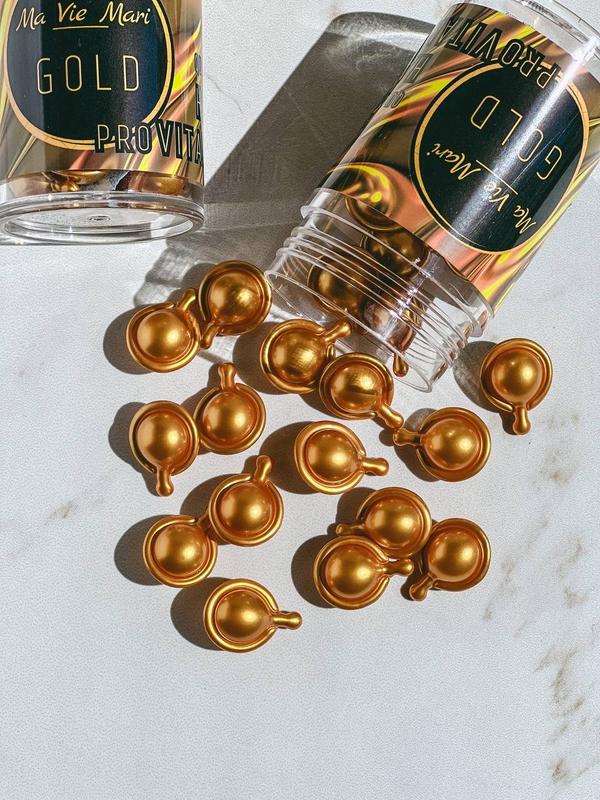 Золоті Незмивні капсульні вітаміни-олія для сухого, ламкого та пористого волосся Ma Vie Mari Hair ProVitamin Gold - 30 шт 🖇️ Допомагають зміцнити сухе волосся і зробити його здоровим, блискучим і слухняним. Утримують вологу, створюють захисний бар'єр на поверхні волосся, запобігають заплутуванню. За рахунок чого здобувається WOW-ефект? Олія жожоба, Олія алое, Соєва олія, Вітаміни В5, Вітаміни А, С, Е, Арганова олія, Марокканська олія. Олія жожоба має високий вміст жирних кислот, вітамінів і антиоксидантів, які сприяють здоров'ю волосся. Вона зволожує волосся, запобігає ламкості і посіченим кінчикам, робить волосся більш м'яким і гладким, допомагає контролювати посилене випадання волосся і стимулює його зростання. Крім того, олія жожоба надає природний блиск і об'єм волоссю, а також захистити його від шкідливого впливу навколишнього середовища. Алое вера має високий вміст води і здатна глибоко зволожувати волосся, роблячи його більш м'яким і блискучим. Підсилення росту волосся. Зменшення ламкості та сухості. Марокканське масло містить у складі вітаміни, антиоксиданти, лінолеву та олеїнову кислоту. Захищає волосся, робить його слухняним, глибоко живить навіть сильно пошкоджені пасма. Вітамін В5 запобігає ламкості, підвищує опірність зовнішньому впливу. WOW-результат: Завдяки застосуванню капсул сухе і посічене волосся швидко набуває здорового блиску, краси, відновлюється і надійно буде захищено від нових пошкоджень. 🖇️Найкращий спосіб застосування: 1. Відріжте носик капсули та видавіть вміст на долоню. 2. На вимите та підсушене рушником волосся розподіліть вміст капсули, уникаючи коріння та шкіру голови. Не потребує змивання. 3. Висушіть волосся звичним для вас способом.