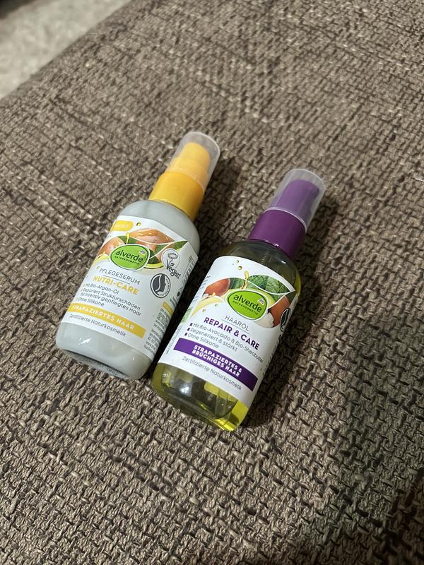 Дуже гарний склад Олія: Формула містить органічне масло авокадо та органічний екстракт масла ши. Продукт регенерує та зміцнює волосся. Олія швидко вбирається, живить волосся та розгладжує його поверхню. Це сертифікована натуральна косметика, веганська та без силіконів. Сироватка: Ідеально підходить для пошкодженого волосся. З органічною аргановою олією. Без аміаку, без силіконів, без сульфатів, веганська. Сироватка для волосся Nutri-Care від Alverde особливо підходить для пошкодженого волосся. Догляд збагачений органічною аргановою олією та органічною олією жожоба. Для інтенсивного догляду за волоссям. Застосування: рівномірно розподіліть по довжині і кінчикам сухого або вологого волосся.