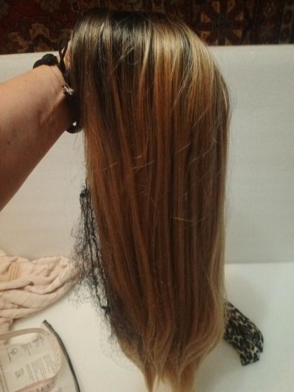 довга і густа перука 180% з дуже реалістичного волосся.. вирощеного в лабораторії і дуже подібного до натурального. на ленті+ пов'язка.можно крутити.
