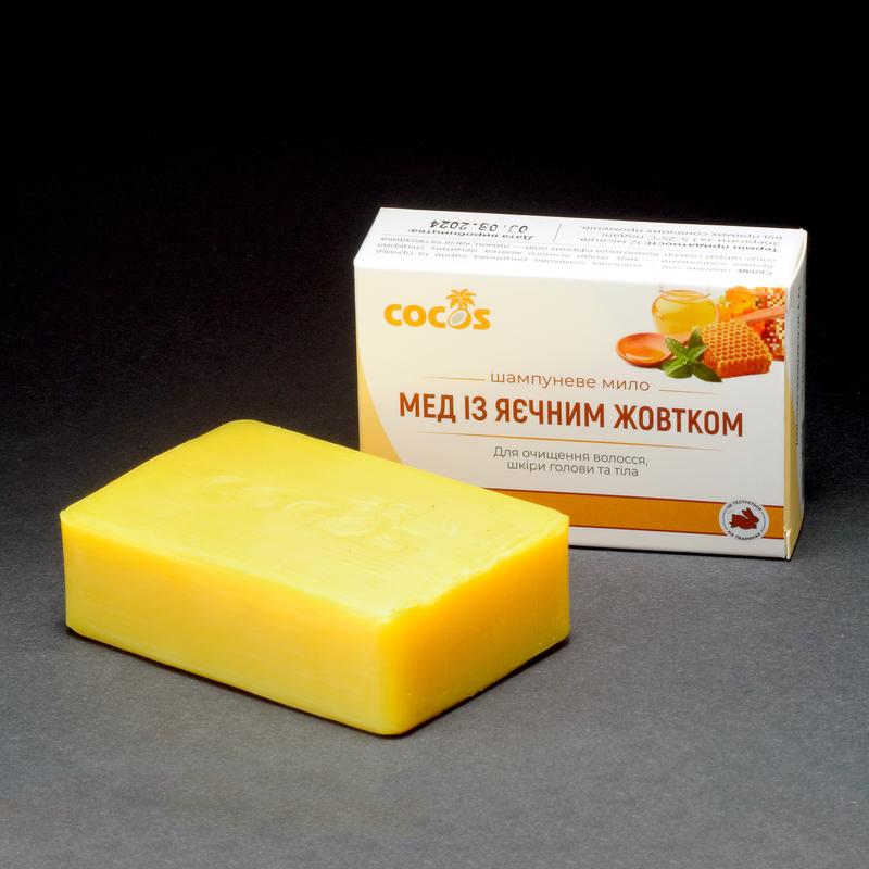 Медовий твердий шампунь з яєчним жовтком -- призначення Напевно ви чули про корисні маски для волосся з медом і жовтком, або ж про домашні шампуні на основі яєчного жовтка. Ось тільки процес вимивання такої субстанції з волосся просто лякає, і невідомо, чи взагалі буде сенс від процедури. Не варто мучити волосся і свої нерви, адже ми живемо в сучасному світі, де створені спеціальні засоби, які насичують волосся корисними компонентами, при цьому комфортні у застосуванні. Один із таких засобів ми готові вам пред'явити - Твердий шампунь Медовий з яєчним жовтком. Це мило ручної роботи з додаванням меду, жовтка та олій. Це шампуневе мило призначене для очищення волосся натурального типу і підійде також тим, у кого слабке та ламке натуральне волосся. Твердий шампунь підходить для щоденного миття, активні компоненти в ньому захищають волосся, насичують його силою та здоров'ям. Властивості - Касторова та кокосова олії -- омиляються лугом, і створюють дуже м'яку миючу композицію, яка підходить для очищення волосся. Така основа дбайливо промиває волосся, не травмуючи його. При цьому чистота волосся та шкіри голови на висоті; - Мед та яєчний жовток -- їх широко використовували ще наші предки. Вони знали про корисну дію цих компонентів на шевелюру. Волосся стає гладким, блискучим, щільним і міцним, швидко росте. Мед і жовток -- комори природи, які багаті на вітаміни і мікроелементи. У чистому вигляді застосовувати їх дуже проблематично, але коли вони входять до складу шампуню, миття волосся перетворюється на комфортну процедуру, від якої ви отримуєте задоволення, а волосся -- користь. Мед і жовток живлять і кондиціонують волосся, захищають його від пересушування; - Цитрат і лактат натрію -- посилюють кондиціонуючий догляд меду та яєчного жовтка, роблячи волосся більш слухняним. Оскільки твердий шампунь є перш за все милом, ми рекомендуємо використовувати його в комплексі з бальзамом-кондиціонером, або обполіскувати волосся після миття підкисленою водою (лимоном або оцтом). Це полегшить розчісування і надасть волоссю гарного блиску. Спосіб застосування 1. Намочіть волосся; 2. Розмийте брусочком шампуню піну, помасажуйте, розподіляючи піну по волоссю; 3. Змийте теплою водою; 4. За потреби повторіть ці дії ще раз; 5. Промийте волосся підкисленою водою або використовуйте бальзам-кондиціонер. Склад: Омилені олії: кокосова, оливкова, рицинова, каріте та гірчиці. Активні компоненти — мед, ліпіди яєчного жовтка, лецитин, гліцерил олеат, цитрат і лактат. Композиція ефірних олій — лимон, касія та гвоздика.