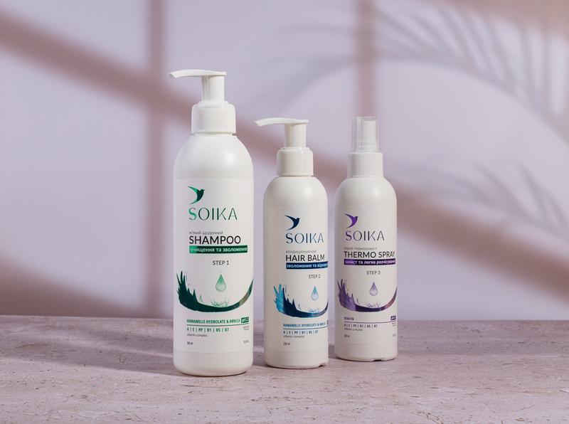 Лінійка бренду SOIKA призначена для всіх типів волосся, максимально збалансована і складається з трьох продуктів: М'який щоденний шампунь 🔸️Підходить для всіх типів волосся 🔸️Завдяки нейтральному рівню pH 5,2 (pH шкіри людини 5,5) шампунь делікатно очищує шкіру голови та волосся 🔸️Не пошкоджує захисний шар шкіри та не травмуючи волосся Кондиціонуючий бальзам 🔸️Активно відновлює та зволожує волосся 🔸️Допомагає позбавити волосся тьмяності, сухості, надмірної пухнастості 🔸️Перешкоджає появі посічених кінчиків Спрей-термозахист 🔸️Сприяє легкому розчісуванню волосся. 🔸️Забезпечує високий рівень захисту від гарячого повітря та високих температур стайлінгових приладів