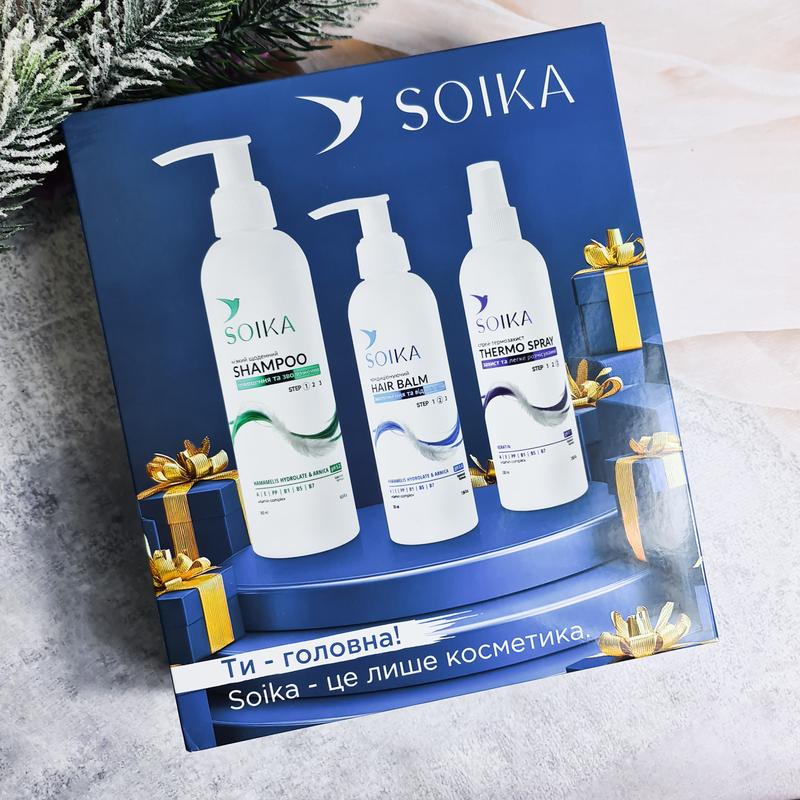 Незадоволені станом свого волосся? Шкіра твоєї голови нормальна, суха чи жирна? А волосся – натуральне, фарбоване, або пористе? Різні типи – догляд один - універсальна серія від SOIKA. 💚 Шампунь для очищення та зволоження: Продукт зволожує, сприяє нормалізації pH, надає об’єм, захищає від сухості, ламкості, надмірного виділення ліпідів. 300 мл 💙 Бальзам для зволоження та відновлення волосся: Легка формула бальзаму не обтяжує волосся, воно стає помітно здоровішим, добре розчісується, набуває природного блиску. 200 мл 💜 Thermo spray Soika : - термозахист від високих температур стайлерів та антистатичний ефект; - збереження кольору волосся та легке розчісування; - відновлення структури волосся зсередини.