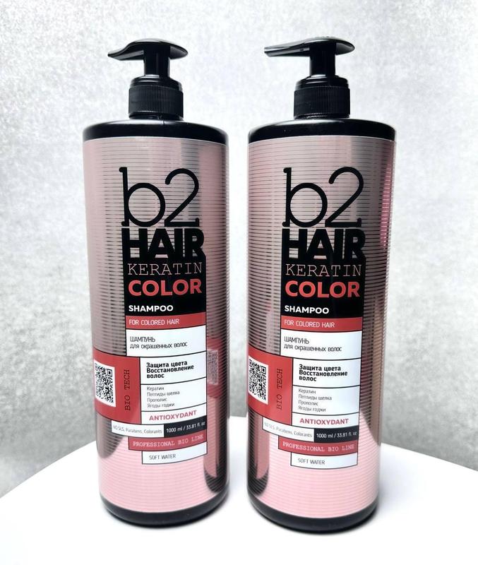 Подарувати пасмам якісний догляд і зберегти їхній колір дає змогу шампунь для фарбованого волосся бренда b2Hair. Формула продукту містить пептиди шовку, кератин, екстракти прополісу, ягід годжі та провітамін В5. Засіб сприяє ретельному очищенню шкіри голови й волосся, а також підтримує насичений відтінок фарбованих пасом. Ніжна консистенція сприяє утворенню легкої піни, активні речовини проникають в структуру тканин і залишають відчуття свіжості, насичений блиск і здоровий вигляд волосся. Особливості b2Hair Keratin Color Shampoo: - усуває забруднення та надлишки себуму; - надає легкий пілінг-ефект; - регулює роботу сальних залоз; - дає змогу уникнути вимивання пігменту; - дарує природне сяйво пасмам; - підтримує гідроліпідний баланс; - відновлює пружність і еластичність; - захищає від термодії; - нейтралізує вплив вільних радикалів, морської й холодної води; - усуває подразнення та запалення. Спосіб застосування Нанести на вологе волосся, спінити, змити засіб водою. Рекомендації: професійні шампуні треба наносити двічі. З першим намилюванням відбувається очищення, і лише повторне застосування виконує доглядову функцію.