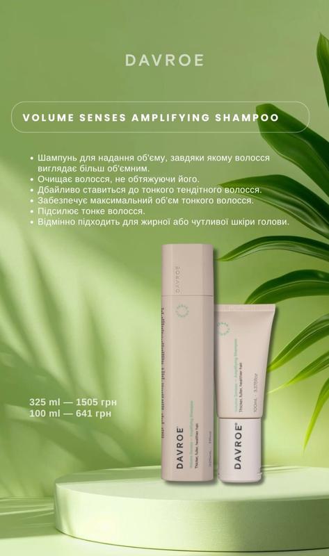 Більш густе, наповнене здоров’ям волосся з Davroe Volume Senses Amplifying Shampoo – шампунь для надання об’єму та блиску волоссю Легкий шампунь делікатно видаляє забруднення і зайвий себум, які можуть обтяжувати волосся. Надає повітряний об’єм. Шампунь просто необхідний для тих з нас, хто має дуже тонке волосся. Надайте своїм локонам блиск, силу та об’єм за допомогою ніжної формули, збагаченої необхідними вітамінами та мінералами. Натуральні зволожуючі компоненти глибоко проникають, додаючи невагомого зволоження, щоб ваше волосся ніколи не було сухим та ламким. Отримайте об’єм своєї мрії за допомогою цього шампуню, а потім скористайтеся кондиціонером Volume Senses Amplifying Conditioner для невагомого зволоження! Натуральні зволожуючі компоненти проникають у волосяний стрижень і додають невагомий об’єм та блиск. Цей м’який, лагідний та делікатний до кольору фарбованого волосся шампунь з екстрактом крес-салату, створений для надання максимального об’єму та кондиціонування тонкому волоссю. Його формула миттєвого розплутування містить протеїни рису та кіноа, які зміцнюють і відновлюють волосся, надаючи йому об’єм та блиск. Пробники по 70 грн якщо шафа то +30 грн І 325 мл /1300 грн