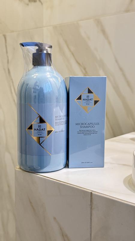 Hadat Microcapsules Shampoo — професійний шампунь із колекції Microcapsules від ізраїльського бренду HADAT COSMETICS, створений для глибокого догляду, відновлення структури волосся та захисту від пошкоджень. Технологія мікрокапсулювання олій та активних компонентів забезпечує доставку поживних речовин безпосередньо в кортекс волосся та епідерміс шкіри голови, створюючи ефект салонного догляду у вас вдома. Мікрокапсули розкриваються при контакті з волоссям, вивільняючи олії та вітаміни, які живлять, зволожують і відновлюють волосся. Олії жожоба та аргани зміцнюють ліпідний бар’єр, екстракт морських водоростей Dunaliella Salina підвищує еластичність і міцність пасом, масло ши захищає волосся від втрати вологи та впливу UV-променів, а вітамін Е діє як антиоксидант, запобігаючи окислювальному пошкодженню волосся. Переваги Hadat Microcapsules Shampoo: 1. Глибоке зволоження: відновлює водний баланс волосся та шкіри голови. 2. Прикореневий об’єм: надає пасмам легкості та пишності без обтяження. 3. Сяйво та блиск: локони виглядають здоровими й природно блискучими. Гладкість і слухняність волосся: полегшує розчісування та укладання. 4. Антиоксидантний захист: запобігає пошкодженню та передчасному старінню волосся. 5. Відновлення ламких кінчиків: зміцнює ослаблені ділянки та зменшує січення. 6. Свіжість шкіри голови: нормалізує роботу сальних залоз і запобігає подразненню. 7. Підходить для всіх типів волосся: сухого, пошкодженого і фарбованого. Дбайливий вплив на колір: зберігає насиченість відтінку фарбованого волосся. 8. Професійний догляд удома: ефект салонної процедури без пересушування. 9. Зручні формати: 250 мл та 800 мл — для домашнього та салонного використання. Hadat Microcapsules Shampoo — це поєднання науки, натуральних компонентів і передових технологій. Подаруйте своєму волоссю м’якість, пружність і сяйво вже після першого використання. Відкрийте для себе інноваційні рішення для м’якого очищення, відновлення та захисту волосся завдяки унікальній формулі Hadat Microcapsules Shampoo, який поєднує потужні натуральні компоненти та сучасні наукові розробки для досягнення максимального результату.