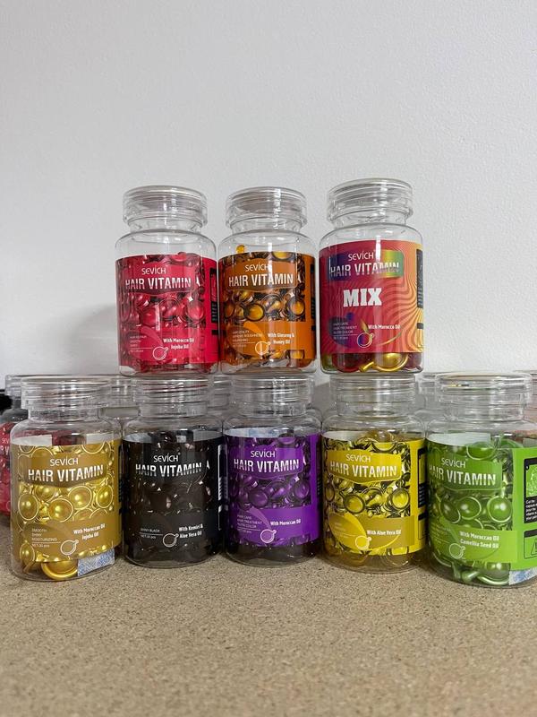 Капсули sevich 30 шт ✨ - жовтий (помʼякшують волосся, живлять, та зберігають вологу) - зелений (відновлюють сухі, посічені кінчики волосся) - оранжевий (для ламкого та пористого волосся) - золотий (до догляду за сухим, тьмяним та нормальним волоссям, допомагають його зберегти гладким та блискучим) - чорний (живить, зволожує, надає блиск, робить волосся слухняним, гладким та міцним) - фіолетовий (доглядає за фарбованим волоссям, воно стає мʼяким, легко розчісується, а колір тримається довше) - червоний (для глибокого відновлення волосся) - мікс (жовтий, фіолетовий, оранжевий, зелений, червоний, чорний, золотий)