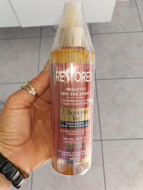 Веганська формула кондиціонера Restorex містить феноменальну суміш з олій абрикосових кісточок, мигдалю, волоського горіха, аргани, оливи, чорного кмину та троянди, яка творить справжні дива з вашими локонами. Дорогоцінні олії дозволять вам досягти шовковистого, сяючого й здорового волосся в короткі терміни. Кондиціонер-спрей Restorex значно полегшить розчісування та забезпечить вашим локонам приголомшливий блиск, шовковистість і безмежну м'якість. Комплекс із цінних біоолій гарантує повноцінний догляд від коренів до кінчиків: Мигдальна олія: пом'якшує волосся й робить його гладеньким, живить, відновлює, захищає від ламкості. Олія волоського горіха: піклується про шкіру голови завдяки вмісту жирних кислот. Олія аргани: допомагає відновити пошкоджені волосяні фолікули, зміцнює локони, зволожує шкіру голови. Олія оливи: інтенсивно зволожує та відновлює посічені кінчики. Олія чорного кмину: підтримує здоров'я шкіри голови та ефективно бореться з лупою. Трояндова олія: надає локонам природного здорового блиску. Олія абрикосових кісточок: живить і зволожує шкіру голови, робить прядки сяючими та еластичними, запобігає ламкості. Після кожного використання кондиціонера "7 олій" ваше волосся виглядатиме як після салону! Продукт не обтяжує волосся, має виключно приємний аромат. Підходить для нормального, сухого та зношеного волосся.
