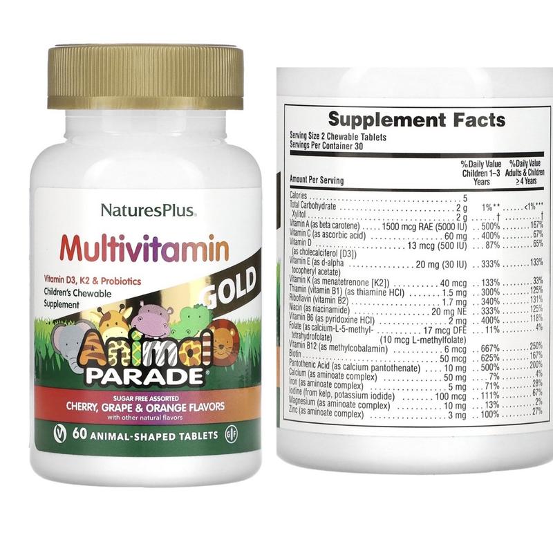 🍓Дитячі Мультивітаміни та мінерали 🍓 🍋Вишня, апельсин і виноград 💊60 шт 🌼Містить інші натуральні ароматизатори 🌼Без глютену 🌼Містить підсолоджувач ксилітол 🌼Містить вітаміни D3 і K2, пробіотики та цілісні продукти, сертифіковані за стандартом Organic Gold Standard 🌼Веганський продукт 🍭Це секретні поживні речовини… завдяки веселим фігурам тварин діти не знають, що Animal Parade GOLD не містить цукру й корисний для них! Animal Parade створює найкращі вітаміни для дітей! 🍭Містить більше 20 органічних харчових інгредієнтів, як-от броколі та шпинат (тільки нічого не говоріть дітям!) 🍭До складу входить 500 МО (13 мкг) вітаміну D3, а також одні з найкращих пробіотиків для дітей. 🍭Підтримує здоров’я імунної системи 🍭Підсолоджено за допомогою ксилітолу, який може знижувати ризик руйнування зубів 🍭Підтримує нормальний процес зростання та розвитку 🍭Поживні речовини в необхідних для дітей кількостях для підтримки здоров’я ваших дітей 🔥 Рекомендації із застосування Як дієтичну добавку давати дітям по дві жувальні таблетки щодня. Призначений для дітей, починаючи з віку, у якому вони можуть безпечно розжовувати їжу, і старших.