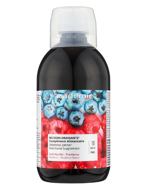 Засіб з лінійки догляду за тілом Academie Body призначений для виведення зайвої рідини, очищення організму і посилення ефекту від антицелюлітних процедур. Натуральні інгредієнти коктейлю мають антиоксидантну функцію, тому очищають організм і дарують відчуття легкості та поліпшене самопочуття. Завдяки дренажній дії з організму виводиться застійна рідина, що провокує набряки і збільшення об'ємів. Для того, щоб посилити вплив процедур контурингу, слід вживати напій, дотримуватися здорового харчування і пройти курс масажу з коригувальними засобами для фігури. Напій зручний у використанні завдяки компактному ковпачку-дозатору. Детокс-коктейль Academie Boisson Drainante призначений для: - очищення організму; - виведення надлишку рідини; - усунення набряклості; - створення відчуття легкості; - збільшення бадьорості; - зниження ваги; - боротьби з целюлітом. Спосіб застосування: відміряти необхідну кількість напою можна за допомогою ковпачка. 1 ковпачок - 25 мл коктейлю, слід розвести в склянці теплої води, потім випити. Курс розрахований на 10 днів. Випивати напій рекомендовано двічі на день. Оптимальна кількість курсів на рік - 2. Якщо ви живете в забрудненій місцевості, то кількість курсів на рік можна збільшити до 3-4.