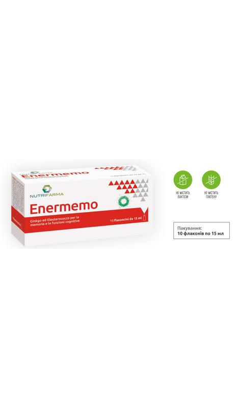 ENERMEMO ПОПОЛНЕНИЕ ЭНЕРГИИ И СТИМУЛЯЦИЯ КОГНИТИВНЫХ ФУНКЦИЙ. НЕ СОДЕРЖИТ ГЛЮТЕНУ НЕ СОДЕРЖИТ ЛАКТОЗЫ Пищевая ценность Среднее содержание на 1 флакон* Карнитин 500мг Аргинин 410мг Сухой экстракт листьев гинкго 300 г из которых гинкгофлавоноидов 72 г Битартрат холина 300 мг Сухой экстракт корня элеутерококка 90 мг, из которого сапонинов 4.5 мг. Сухой экстракт корня женьшеня 50 мг, из которого гинзенозидов 15 мг. Показания к применению: • Полная поддержка мозговой деятельности в периоды интенсивного умственного напряжения или продолжительного стресса, когда наблюдается снижение работоспособности мозга. Упаковка: 10 флаконов по 15 мл Карнитин Энергетическая поддержка метаболизма. Аргинин Полезен для предотвращения физической и умственной усталости. Гинкго билоба Способствует циркуляции крови даже на уровне головного мозга. Битартрат холина Увеличивает запасы ацетилхолина в мозге, что необходимо для функциональности нейромедиаторов. Элеутерококк Поддерживает память и когнитивные функции. Женьшень Снимает умственную усталость и повышает физическую выносливость. Ингредиенты: вода, фруктоза, мальтодекстрин, L-карнитин, L-аргинин, сухой экстракт листьев гинкго (Ginkgo biloba L.) с содержанием 24% гинкгофлавоноидов, холин битартрат, сухой экстракт корней элеутерококка (Eleutherococ сухой экстракт корней женьшеня (Panax ginseng CA Meyer) с содержанием 30% гинзенозидов, регулятор кислотности: лимонная кислота, консерванты: сорбат калия, бензоат натрия, ароматизатор: апельсин. Способ применения: 1 флакон утром перед завтраком. Наличие мелких нерастворенных частиц обусловлено высокой концентрацией растительных экстрактов и не влияет на качество продукта.