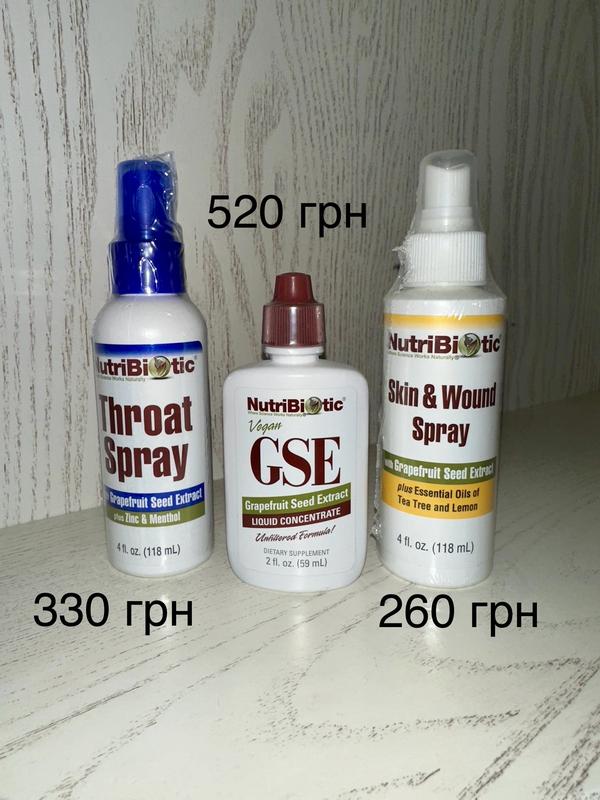 1. Спрей для горла NutriBiotic з цитрицидом (екстракт насіння грейпфрута), цинком та ментолом сприяє зміцненню здоров’я ротової порожнини та горла. 2. GSE - екстракт грейпфрутових кісточок. 3. Спрей для загоєння ран на шкірі від NutriBiotic містить Citricidal — сполуку, отриману з насіння та м’якоті грейпфрута й використовується медичними працівниками по всьому світу, а також ефірні масла чайного дерева та лимона.