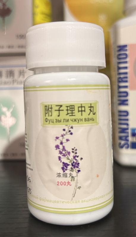 Фу Цзи Лі Чжун Вань 附子理中丸 Fu Zi Li Zhong Wan концентровані пилюлі для шлунка 200 шт. Симптоми. Давні поноси (без запаху), поганий апетит, що носять біль у животі (масаж і тепло полегшують біль), нудота, блювота, холодні кінцівки, важкість у тілі, одишка, слабкість і швидка стомлюваність, біль у серці, що провокуються холодом. Мова товста бліда, наліт білий і слизький. Пульс глибокий рідкісний, без сили. Клінічні показання. Хронічний гастроентероколіт, спастичний коліт, виразкова хвороба шлунка та дванадцятипалої кишки (з вищеописаною симптоматикою), хронічні поноси, ДБС, стенокардія (холодова). Склад Fu Zi Аконіта корінь оброблений Radix Aconiti praeparata Dang Shen Кодонопсиса дрібноволосистого корінь Radix Codonopsis pilosulae Bai Zhu Атрактилодеса грубого кореневище Rhizoma Atractylodis macrocephalae Gan Jiang Імбиру кореневище Rhizoma Zingiberis Gan Cao Солодки корінь Radix Glycyrrhizae Дія з погляду традиційної китайської медицини. Зігріває Ян, виганяє Холод. Живить Ци, зміцнює Селезінку. Використовується у разі синдрому Пустого Холоду у Середньому нагрівачі. Фармакологічна дія. Зупиняє діарею, зміцнює імунітет. Форма випуску. Концентровані пилюлі — 200 кульок масою 0,17 г у флаконі. Спосіб застосування та дозування. Приймають усередину по 4-8 штук 2-3 рази на день за 30 хвилин до або через 1 годину після їди, запиваючи теплою кип'яченою водою або за призначенням лікаря. Заходи безпеки та особливі вказівки. Виключити вживання холодної та сирої їжі. Протипоказання. Вагітність.
