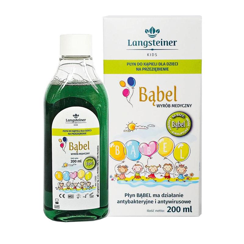 Концентрат Langsteiner Bąbel призначена для інгаляцій під час купання дитини в сезон простудних захворювань. Допомагає подолати застуду. Захищає шкіру від подразнень і сухості. Містить сосну та лаванду, речовини зі зволожуючими, заспокійливими та антиоксидантними властивостями. Кокамідопропіл бетаїн, отриманий з кокосової олії, має антибактеріальну дію та захищає ліпідний шар на шкірі, тому шкіра не пересихає після купання. Евкаліптова олія має антибактеріальну та противірусну дію. Вдихання ефірної олії евкаліпту під час прийняття ванни підтримує лікування застуди та грипу і розблоковують дихальні шляхи. Знищує віруси, грибки, бактерії, найпростіші та кліщі. Призначено для купання під час простудних захворювань. Можна використовувати з 2 років.
