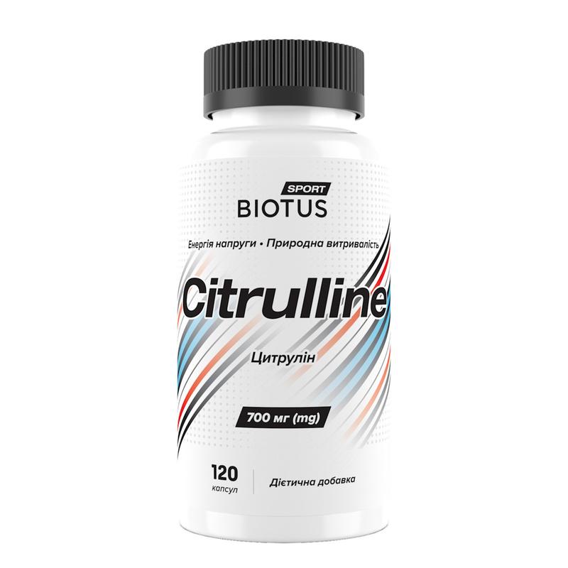 Дієтична добавка Citrulline від українського бренду Biotus, створена на основі цитруліну малату, для включення його в щоденний раціон, Цитрулін бере активну участь в енергетичному обміні та сприяє розширенню судин Рекомендована добова доза: 1 капсула Кількість на порцію (1 капсула) Цитруліну малат 700 мг
