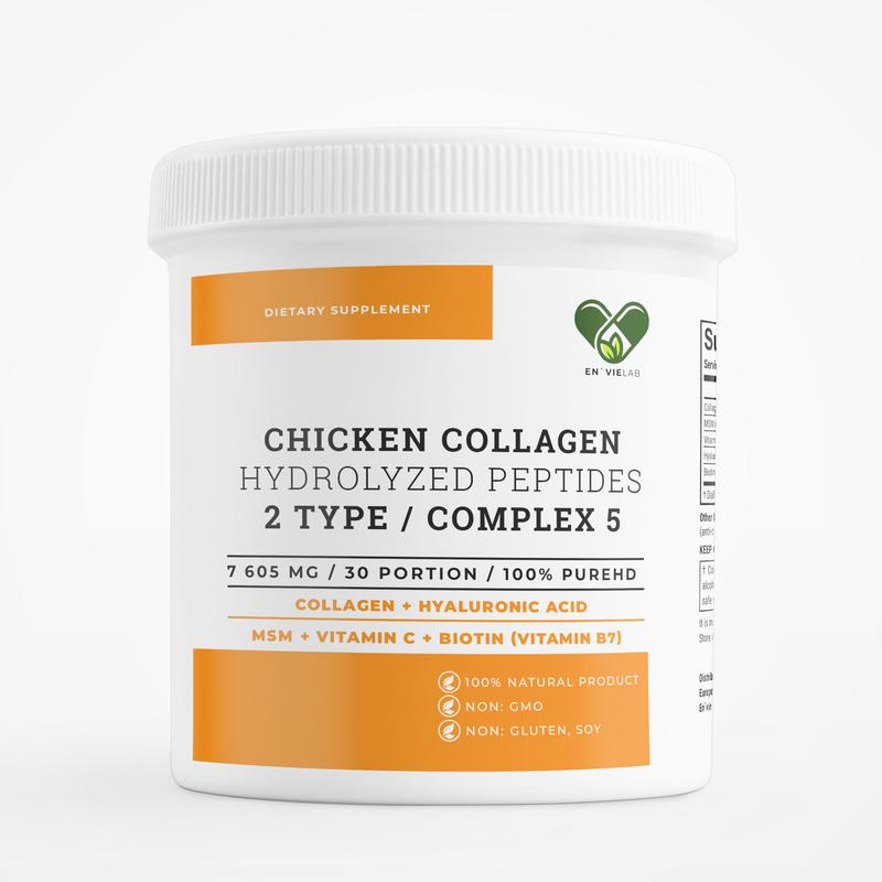 Коллаген 2 типа с биотином, гиалуроновой кислотой и МСМ En'vie Lab Complex 5 - премиальный питьевой комплекс, который объединяет - коллаген 2 типа (5000 мг) - метилсульфонилметан (МСМ - 2000 мг) - биологически активный витамин С (аскорбат натрия - 500 мг) - гиалуроновую кислоту (100 мг) - высокодозированный биотин (витамин В7 - 5000 мкг). Этот мощный комплекс разработан для эффективного укрепления суставов, хрящей, связок, поддержания красоты кожи, волос и ногтей. Куриный коллаген 2 типа помогает восстанавливать хрящевую ткань, повышает прочность и подвижность суставов, уменьшает воспалительные процессы, обеспечивая активный и комфортный образ жизни. МСМ обладает выраженными противовоспалительными свойствами, способствует уменьшению дискомфорта и боли в суставах, улучшает здоровье волос, кожи и ногтей. Гиалуроновая кислота обеспечивает глубокое увлажнение кожи, сохраняет ее упругость и эластичность, улучшает амортизацию суставов, уменьшая риск их износа. Биотин (витамин В7) улучшает состояние волос и ногтей, предупреждает их ломкость, поддерживает общее состояние здоровья кожи, укрепляет иммунитет и стимулирует метаболические процессы. Буферизированный витамин С (аскорбат натрия) усиливает синтез коллагена, укрепляет иммунитет, обеспечивает антиоксидантную защиту клеток и оказывает мягкое действие на пищеварительную систему. Противопоказания: индивидуальная непереносимость компонентов состава. Предостережение: не заменяет обычную пищу. Перед применением проконсультируйтесь с врачом. Диетическая добавка не является лекарственным средством. Условия хранения: хранить в недоступном для детей месте, избегать попадания прямых солнечных лучей, при температуре не выше +25 °С и относительной влажности не более 80%. Срок годности: 24 месяца с даты производства. Дата производства: указана на упаковке. Сертификация: товар имеет сертификаты HACCP и IS**********. Комплекс доступен в фасовке на 30, 60 или 90 порций. Рекомендуется принимать одну дневную порцию, растворив ее в стакане воды. Покупайте качество, а не цену -- выбирайте питьевой коллаген 2 типа En'vie Lab Complex 4 для здоровья суставов и вашей активности!