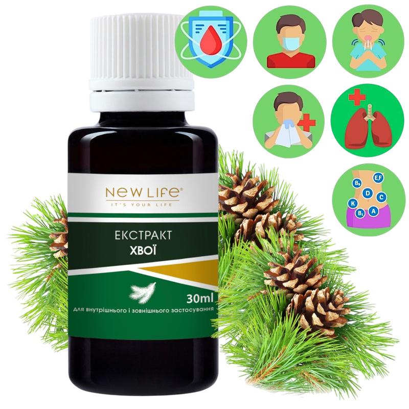 Хвої Екстракт Добавка Дієтична Нове Життя (New Life) 30 мл Рекомендовано приймати при запаленні дихальних шляхів, суглобів, шлунково- кишкових хворобах. Покращує роботу сечостатевої системи. Перешкоджає тромбоутворенню. РЕКОМЕНДАЦІЇ ДО ВИКОРИСТАННЯ: по 7-10 крапель 2-3 рази на день до їжі на воді. 1 флакончик 30 мл вистачає на 2-3 тижні. Рекомендований курс прийому від 1 місяця. Тривалість прийому залежить від ступені важкості та занедбаності процесу. Не викликає звикання, працює деякий час після закінчення прийому. Дітям - по 1-5 крапель 2-3 рази на день до їжі на воді. Зовнішньо для полоскань - 5 крапель на склянку теплої води. ФОРМА ВИПУСКУ: 30 мл у пластиковому флаконі, фірмова упаковка. СКЛАД: Активні компоненти/active ingredients - хвоя сосни/pinus acus Допоміжні компоненти/other ingredients - вода демінералізована/aqua, пропіленгліколь/propylenglycolum, гліцерин/glycerolum ТЕРМІНИ І УМОВИ ЗБЕРІГАННЯ: Зберігати 3 роки від дати виготовлення у сухому, захищеному від світла та недоступному для дітей місці при температурі не вище +25˚С та відносній вологості повітря не більше ніж 85%. Після відкриття термін зберігання 3 місяці. ПОПЕРЕДЖЕННЯ: індивідуальна чутливість до компонентів. Якщо людина схильна до алергії необхідно уважно вивчити склад перед покупкою. ОПИС АКТИВНИХ КОМПОНЕНТІВ ✔️ Хвоя сосни -- має протизапальну, відхаркувальну, протимікробну властивості, являється сечогінним, вітамінним і кровоочисним засобом. ✔️ Приймають при запальних захворюваннях суглобів, сечостатевої системи, дихальних шляхів - бронхіті, пневмонії, ангіні, грипі, шлунково-кишкових хворобах, гастриті з підвищеною кислотністю, гепатиті, виразковій хворобі, коліті; при порушенні обміну речовин: подагрі, цинзі, анемії. ✔️ При тромбофлебіті хвоя знімає запалення вен, перешкоджає тромбоутворенню. ✔️ Зовнішньо застосовують при шкірних захворюваннях, для заспокійливих ванн при неврозах, при захворюваннях опорно-рухового апарату: остеохондрозі, артритаі; для інгаляцій при простудних захворюваннях і як загальнозміцнюючий засіб