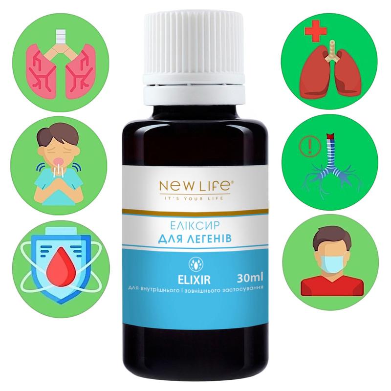 Еліксир Для Легенів Добавка Дієтична Нове Життя (New Life) 30 мл Рекомендовано як протизапальний, спазмолітичний, бактеріцидний засіб. Застосовується для профілактики гострих і хронічних захворювань дихальних шляхів. РЕКОМЕНДАЦІЇ ДО ВИКОРИСТАННЯ: по 7-10 крапель 2-3 рази на день до їжі на воді. 1 флакончик 30 мл вистачає на 2-3 тижні. Рекомендований курс прийому від 1 місяця. Тривалість прийому залежить від ступені важкості та занедбаності процесу. Не викликає звикання, працює деякий час після закінчення прийому. ФОРМА ВИПУСКУ: 30 мл у пластиковому флаконі, фірмова упаковка. СКЛАД: Активні компоненти/active ingredients: підбілу трава/farfarae herba, алтея корінь/althaeae radix, подорожника лист/plantaginis majoris folium, липи цвіт/tiliae flores, ромашки квіти/matricariae flos, шавлії трава/salviae herba, солодки корінь/liquiritiae radix, буркуну трава/meliloti herba. Допоміжні компоненти/other ingredients: вода демінералізована/aqua, пропіленгліколь/propylenglycolum, гліцерин/glycerolum. ТЕРМІНИ І УМОВИ ЗБЕРІГАННЯ: Зберігати 24 місяці від дати виготовлення у сухому, захищеному від світла та недоступному для дітей місці при температурі не вище +25˚С та відносній вологості повітря не більше ніж 85%. Після відкриття термін зберігання 3 місяці. ПОПЕРЕДЖЕННЯ: індивідуальна чутливість до компонентів. Якщо людина схильна до алергії необхідно уважно вивчити склад перед покупкою. ОПИС АКТИВНИХ КОМПОНЕНТІВ Підбілу трава -- має протизапальну, відхаркувальну, спазмолітичну, потогінну властивості. Використовується при захворюваннях дихальних шляхів, що супроводжуються кашлем, розріджує та виводить мокротиння, знімає запалення та очищує дихальні шляхи. Алтея корінь -- має обволікаючу, протизапальну, відхаркувальну властивості. Заспокоює кашель, знімає спазм бронхів при бронхіальній астмі, сприяє швидкому загоєнню слизових оболонок. Діючі речовини алтея розріджують мокротиння і стимулюють його відходження, активізують моторику дихальних шляхів. Подорожника лист -- надає відхаркувальну дію, виводить мокроту, проявляє антисептичну, протизапальну, спазмолітичну, ранозагоювальну властивості. Липи квіти -- мають протизапальну, спазмолітичну, протимікробну, відхаркувальну, жарознижуючу властивості. Допомагають при хворобах органів дихання, що супроводжуються кашлем, нежиттю, підвищеною температурою. Ромашки квіти -- проявляють антибактеріальну і протизапальну дії. Ефективні в лікуванні застудних і гострих респіраторних захворюваннях: пом'якшують і зволожують слизову оболонку горла та дихальних шляхів, покращують відходження мокроти, усувають кашель і його прояви у вигляді першіння та скупчення слизу в бронхах. Шавлії трава -- надає протизапальну, протимікробну і заспокійливу дії. Знімає набряк мигдалин, збільшує захисні властивості організму. Солодки корінь -- містить сапоніни -- це речовини, які подразнюють слизову оболонку легень, стимулюючи секрецію епітелію і покращуючи виділення мокроти. Робить мокроту менш в'язкою -- вона легше і швидше виводиться. Крім цього, солодка знімає запалення і має загальнозміцнюючу дію. Буркуну трава -- має протизапальну, відхаркувальну, антисептичну, потогінну, болезаспокійливу властивості. Застосовується при захворюваннях органів дихання, хронічному бронхіті, кашлі, гострих респіраторних захворюваннях.