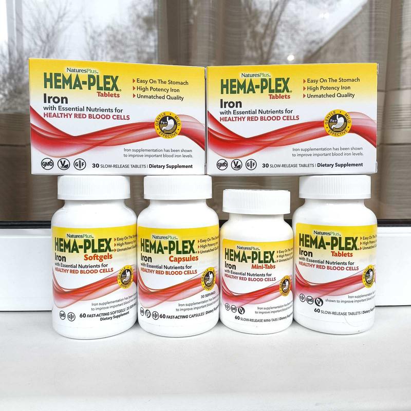 Natures Plus Залізо з мікроелементами, які сприяють засвоєнню заліза. Допомагає підвищити гемоглобін і феритин! Виробництво США. Hema-Plex від Natures Plus. Комплекс містить залізо (у вигляді біодоступного амінокислотного комплексу/хелату), а також вітаміни та мікроелементи, які сприяють засвоєнню заліза. -- Hema-Plex, залізо із повільним вивільненням (порція 1 шт): 30 таблеток - 475 грн 60 таблеток - 945 грн -- Softgels: Hema-Plex, 60 швидкодіючих капсул (порція 3 шт) - 530 грн -- Capsules: Hema-Plex, 60 швидкодіючих капсул (порція 2 шт) - 600 грн -- Mini tabs: Hema-Plex, залізо з незамінними поживними речовинами для здоров’я еритроцитів, 60 мінітаблеток із повільним вивільненням (порція 2 шт) - 590 грн.