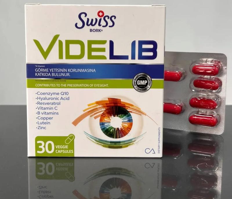 Swiss Bork Videlib — це дієтична добавка у формі капсул, розроблена для підтримки здоров'я очей та збереження гостроти зору. Вона містить комплекс вітамінів, мінералів та антиоксидантів, які захищають очі від окислювального стресу та підтримують їх функціональність. Основні інгредієнти та їх властивості: Лютеїн: Підвищує гостроту зору в сутінках і темряві, діє як фільтр шкідливого синього світла та захищає клітини сітківки. Ресвератрол і Вітамін С: Захищають сітківку очей від пошкоджень вільними радикалами. Коензим Q10: Сприяє регенерації тканин та може уповільнювати прогресування захворювань очей. Гіалуронова кислота: Допомагає підтримувати рівень зволоження в очах. Цинк і Мідь: Важливі мінерали, які підтримують здоровий зір та захист тканин очей. Вітамін А та вітаміни групи В (B2, B5, B6): Сприяють нормальній зоровій функції та зменшенню втоми очей.