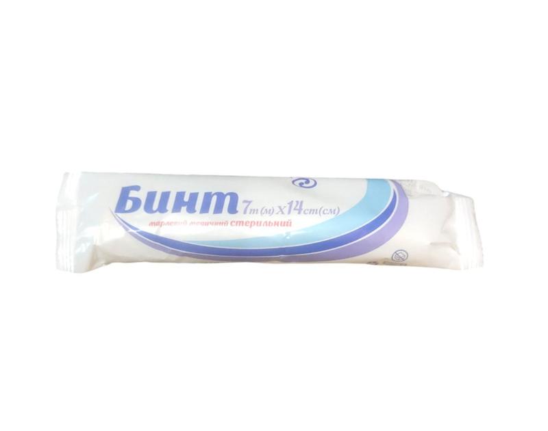 Бінт марлевий стерильний 7 м х 14 см Бінт медичний стерильний виготовляється з бавовняної марлі простого плетіння. Бінти марлеві відбілюються без використання хлору. Бінти - високо поглинаючий матеріал, що особливо важливо при застосуванні в хірургії та інших галузях медицини. Якість медичних бінтів підтверджують такі показники, як: щільність плетіння марлі, з якої виготовляються бинти; щільність скручування бинта; рівномірність крайового зрізу бинта; надійність упакування. Застосовуються для перев'язки відкритих ран, опіків та фіксації пов'язок у стерильних умовах для збереження стерильності раньової поверхні. Бінти медичні - предмет першої необхідності у домашній або автомобільній аптечках.