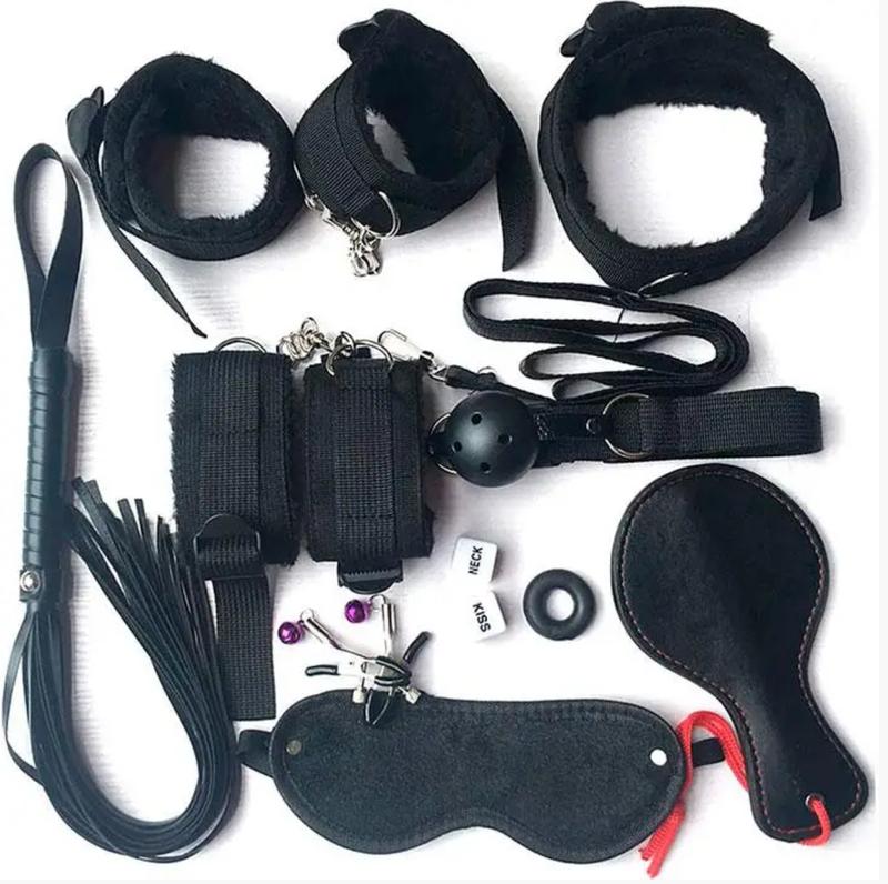Практикуєте жорсткі БДСМ ігри або тільки плануєте відкрити завісу таємниці та зануритися у світ нестандартних ласк? Тоді вам знадобиться розкішний набір аксесуарів, що складається з 10 інструментів. Девайси виготовлені з високоякісної еко-шкіри, яка відмінно зберігає свої властивості і характеристики протягом тривалого використання! До комплекту входять: 1. Шкіряна маска на гумці, з внутрішньої сторони велюр (19х7 см) 2. Кляп: пластикова кулька з отворами на шкіряному ремінці з регульованою застібкою (довжина ремінця 62 см, діаметр кулі 4,5 см) 3. нашийник із повідцем. З внутрішньої частини нашийника штучне хутро, є півкільце для повідця і ремінець з регульованою застібкою (43х5 см, ремінець + 8 см.). Повідець з карабіном і тримачем для руки (97х1 см) 4. Наручники, з внутрішньої частини штучне хутро, на ремінці з регульованою застібкою, з'єднані ланцюжком з карабіном на одній стороні (27х5 см, ремінець + 10 см) 5. Поножі, з внутрішньої частини штучне хутро, на ремінці з регульованою застібкою, з'єднані ланцюжком з карабіном на одній стороні (27х5 см, ремінець +10 см) 6. Шкіряний батіг, дерев'яна ручка, обмотана шкірою, тримач для руки і 20 тонких смужок (ручка 16 см, смужки 32 см) 7. Шкіряна міні-шльопалка з контрастним швом і шнурком на руку. 8. Ерекційне кільце для пеніса 9. Секс кубики 10. Металеві затискачі для сосків з гумовими наконечниками, шурупом регулятором і маленьким дзвіночком (6 см)