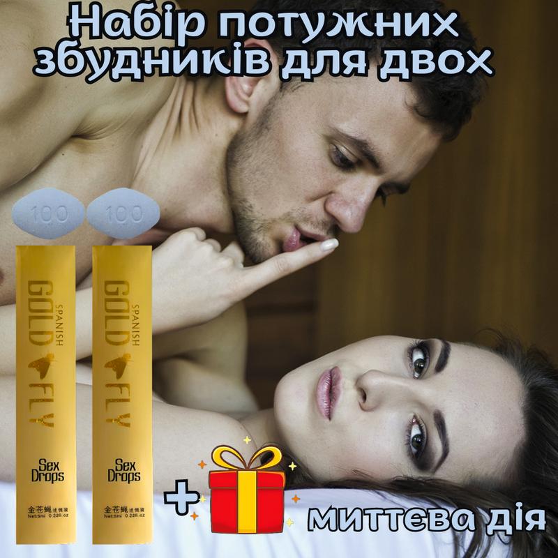 Плюс приємний ПОДАРУНОК: ЧОЛОВІЧИЙ або ЖІНОЧИЙ збудник на пробу. Уточнюйте під час оформлення замовлення, який подарунок є кращим. Зверніть увагу! У набір входить: 2 чоловічі таблетки (пролонгатор та зміцнюють потенцію); 2 жіночих стіки (викликають бажання сексу та посилюють відчуття в процесі). Жіночий препарат Шукаєте щось, щоб урізноманітнити своє сексуальне життя? Спробуйте натуральний жіночий збудник у краплях. Цей потужний підсилювач оргазму є безпечним для здоров'я і не викликає звикання. Краплі для оргазму ідеально підходять для створення нових та захоплюючих відчуттів у вашому інтимному житті. Крім цього, краплі абсолютно без смаку та запаху, що робить їх непомітними. І, звичайно, вони можуть бути додані до алкоголю, щоб створити більш розслаблену та задовільну атмосферу. Спробуйте жіночий збудник і виявіть нові грані насолоди, які раніше видавались недосяжними. Чоловічий препарат Шукаєте безпечний та ефективний чоловічий збудник для покращення сексуального життя? Наш чоловічий збудник Віагра - це саме те, що вам потрібно. Наші таблетки для ерекції є потужним чоловічим збудником, який не тільки забезпечує міцний стояк, а й допомагає затримати еякуляцію, забезпечуючи довгий та насичений секс. Чоловічий пролонгатор відрізняється високою безпекою та не викликає звикання, що робить його ідеальним вибором для підвищення потенції. Таблетки для довгого сексу спеціально розроблені для чоловіків, які бажають покращити своє сексуальне життя та задовольнити свого партнера. Спробуйте зараз і відчуйте різницю! Інструкція для жіночих стиків: один стик - одна доза. Додавати в будь-яку рідину, окрім окропу, об'ємом від 50 до 200 грам. Максимальне дозування на добу - 2 стики. З алкоголем сумісні. Інструкція для чоловічих пігулок: приймати не більше однієї таблетки на добу за 10-15 хвилин до статевого акту. Сумісні з алкоголем у невеликих кількостях. Максимальне дозування - 1 таблетка на добу. Ефект проявляється за наявності сексуальної стимуляції. З алкоголем сумісні. *Доставка по всій Україні; * Не потрібно платити наперед; * Допомога у підборі ліків; *Широкий асортимент чоловічих і жіночих збудників; * Повна анонімність 100%; * Заказ можна оформити через *****/********/********