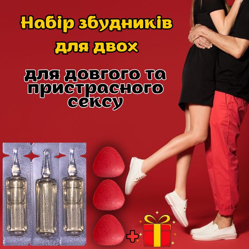Плюс приємний ПОДАРУНОК: ЧОЛОВІЧИЙ або ЖІНОЧИЙ збудник на пробу. Уточнюйте під час оформлення замовлення, який подарунок є кращим. Зверніть увагу! У набір входить: 3 чоловічі таблетки (пролонгатор і зміцнюють потенцію); 3 жіночі ампули (викликають бажання сексу та посилюють відчуття в процесі). Жіночий препарат Поліпшіть своє сексуальне життя з натуральним жіночим збудником - жіночими краплями для оргазму. Цей потужний жіночий збудник у краплях безпечний для здоров'я та не викликає звикання, забезпечуючи максимальне задоволення від інтимних моментів. Непомітний жіночий збудник без запаху, смаку та кольору дозволяє насолоджуватися моментами пристрасті без будь-яких відволікаючих факторів. Додайте краплі в алкоголь, щоб створити атмосферу романтики та зміцнити зв'язок із партнером. Відчуйте повну силу посиленого збудження із жіночим підсилювачем оргазму, який допоможе досягти нових вершин задоволення. Використовуйте жіночу віагру для збільшення сексуального бажання та впевненості. Чоловічий препарат Потужний чоловічий збудник гарантовано дозволить чоловікам не переживати про стійкість ерекції у потрібний момент, покращить лібідо та сексуальне бажання. Безпечний чоловічий збудник не викликає звикання та сумісний з алкоголем, оскільки створений на основі рослинних компонентів. Прийом чоловічого пролонгатора позитивно впливає на організм загалом, покращує приплив крові до пеніса, збільшуючи його розмір. Таблетки для підвищення потенції змусять забути про проблеми у ліжку, повернуть впевненість у чоловічій силі та збільшать тривалість статевого акту. Інструкція для чоловічих пігулок: приймати не більше однієї таблетки на добу за 10-15 хвилин до статевого акту. Сумісні з алкоголем у невеликих кількостях. Максимальне дозування - 1 таблетка на добу. Ефект проявляється за наявності сексуальної стимуляції. З алкоголем сумісні. Інструкція: для жіночих ампул одна ампула - одна доза. Додавати в будь-яку рідину, окрім окропу, об'ємом від 50 до 200 грам. Максимальне дозування на добу - 2 ампули. З алкоголем сумісні. *Доставка по всій Україні; * Не потрібно платити наперед; * Допомога у підборі ліків; *Широкий асортимент чоловічих і жіночих збудників; * Повна анонімність 100%; * Заказ можна оформити через *****/********/********