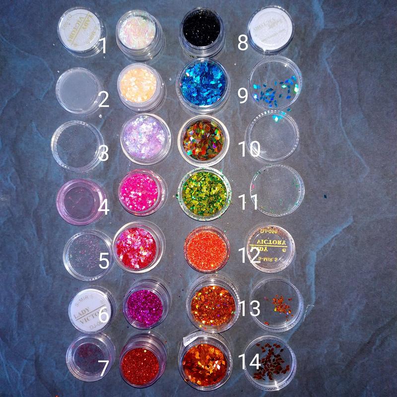 Резкий декор для ногтей слюда посыпка блестки крошка ромбы декор ночь в баночках Много различного. Купила, пролевали, так и не использовала. В наличии 1 - слюда полоски белый цвет, прозрачные, переливаются на свету 2 - крошка с настоящей ракушки нежно-персиковый цвет 3 - слюда кусочки сиреневый, прозрачные, переливающиеся на свету 4 – мелкие шестигранники, розовые яркие, полупрозрачные, переливающиеся. 5 - слюда кусочки розовые, прозрачные, переливаются на свету 6 - блески фуксия мелкие 7 - блестки красные мелкие 8 - блестки черные с коричневым оттенком мелкие 9 – ромбы плоские, голубые голографические. 10 - шестигранники крупные, голубой зеленый золото, полупрозрачные, переливающиеся. 11 – слюда, шматочки. 2 вида зеленого 12 - блестки оранжевый мелкие голографические 13 - шестигранники мелкие, рыжие голографические 14 - ромбы плоские, рыжие, голографические Цена: 20 грн по запуску Внимание! Минимальный заказ из категории для маникюра - 50 грн В Херсоне можно забрать в районе Моцарт. Отправлю Укр-почтой или Новой почтой. Наложенным платежом не отправляю. Проверяйте перед получением, обменом или возвратом нет