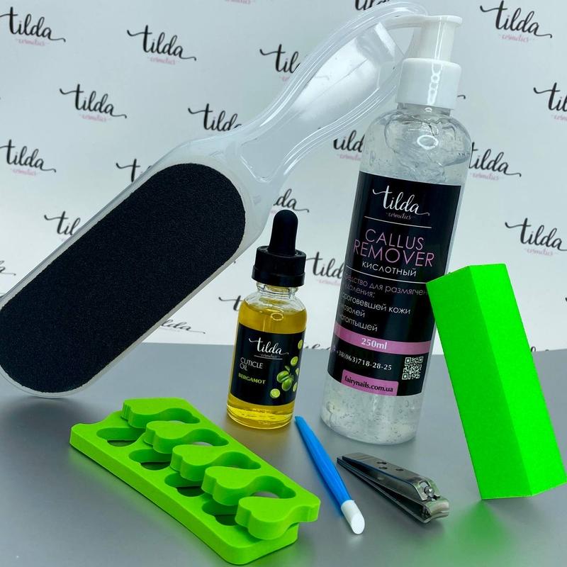 Набор для педикюра 01 Цена 325 грн В набор входит: 1. Кислотный пилинг для педикюра Tilda cosmetics 250 мл 2. Масло для кутикулы Tilda cosmetics 30 мл 3. Книпсер для ногтей 4. Пилочка для шлифовки 5. Баф 6. Разделитель для пальцев (пара) 7. Пластиковый пушер для кутикулы с силиконовым наконечником.